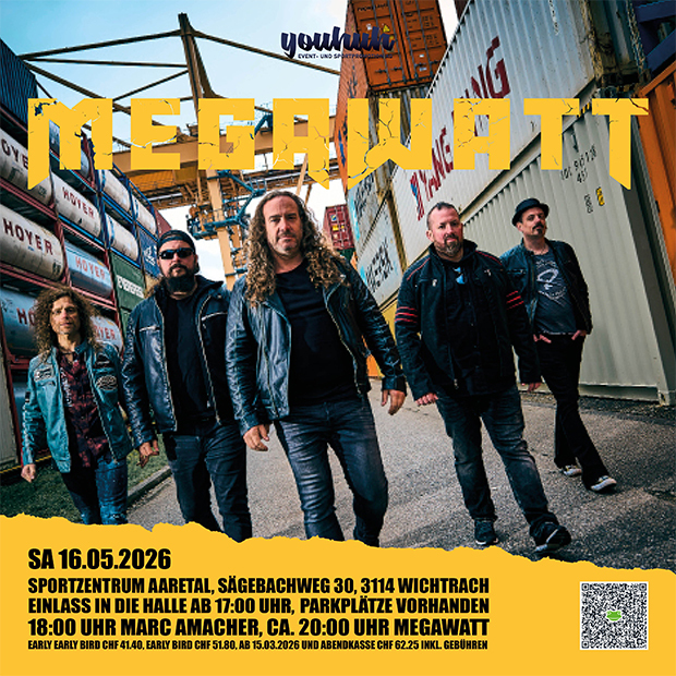 Wir freuen uns sehr, am 16.05.2026 Megawatt und Marc Amacher im Sportzentrum Aaretal in Wichtrach begrüssen zu dürfen.